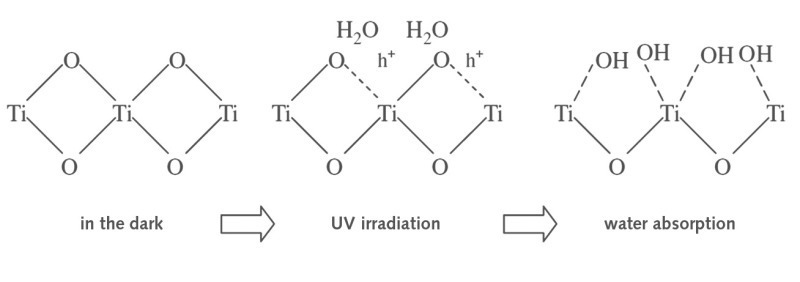 The bonding energy between Ti and O wears out when TiO2 is irradiated under ultraviolet light. Therefore, water molecules clinging to the surface snap the Ti-O-Ti bond, replacing it with Ti-OH bonds and making it possible for a super hydrophilic surface to emerge.