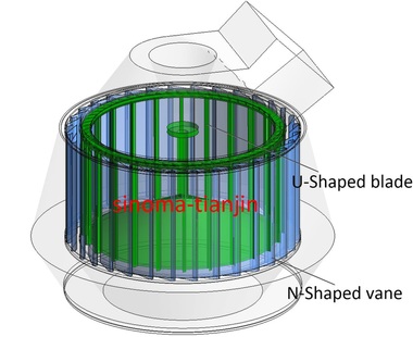 The classifier is a core device in a recirculation grinding system, and has a great influence on product quality, output and power consumption. In order to reduce the power consumption of a grinding system and improve the product quality, the classifier has been thoroughly studied at home and abroad [1-5]. The classifier with U shape blades is the first generation of centripetal classifier originally proposed and developed by the Tianjin Cement Industry Design and Research Institute Co., Ltd., and is based on a large number of CFD theoretical studies [6-11]. Because the moving blades of the NU classifier have a unique aerodynamic shape, they can move the air flow between adjacent moving blades to the inside of the rotor during the rotation of the rotor. This action generates centripetal dynamic pressure and helps the air flow through the rotor of the separator, resulting in a reduction in resistance. The common classifier has only one kind of pulling force from the fan. In contrast, the outer wind wing of the U-shaped moving blade has an additional pulling force on the particles in the classifying area, which allows the product particles to pass through the classifying area faster and improves the classifier’s efficiency. In addition, at the same rotor speed, the airflow in the classifying area of the NU classifier has a higher tangential speed than that of a common classifier because the moving blade has a unique groove structure. The function of the unique structure not only improves the classifying efficiency, but also ensures clear classification. Moreover, the NU classifier can obtain the same product fineness as common classifiers at a lower speed, which is very helpful for further improving the efficiency of powder selection and system production capacity.