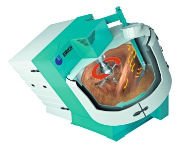 The power input into the mix can be specifically adjusted to the product. Optimum mixing and dispersing effects are achieved without choppers. With sizes from 1 to 3000 l, just a single rotating tool is needed, so upscaling is simple. With an Eirich mixer there is no demixing so that all the formulas have the same mixing times.