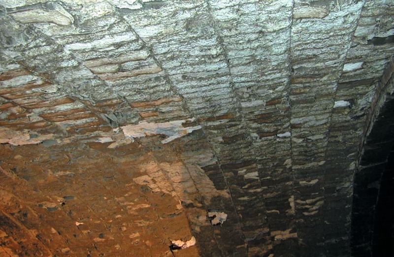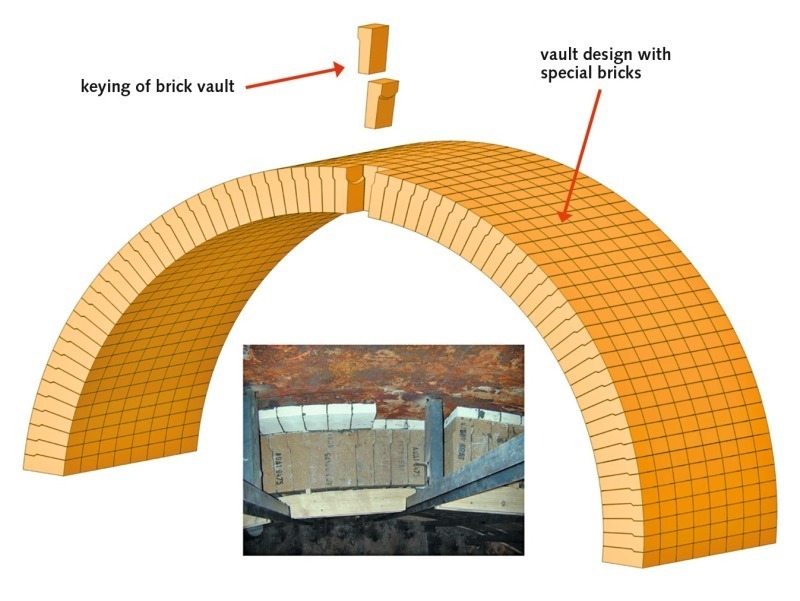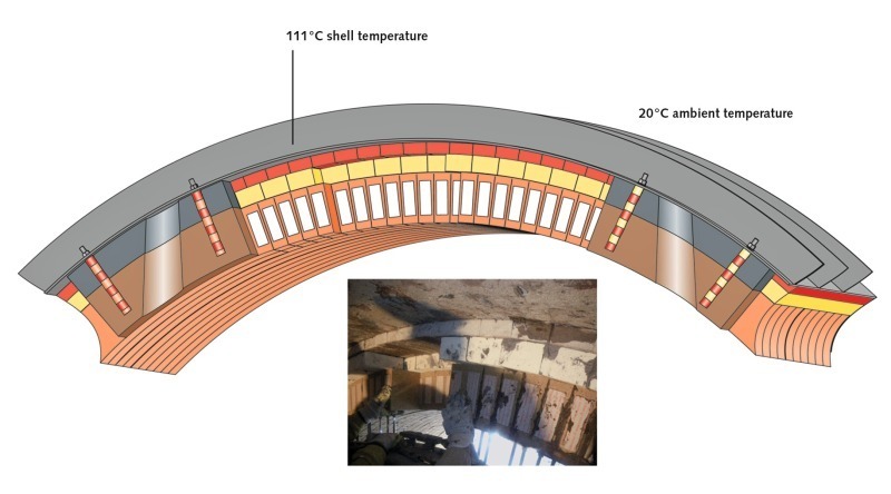 Figure 4 shows the refractory construction of the kiln hood vault in a leading German cement plant. The relatively large vault diameter of about 9 m was lined in two layers with a total thickness of 350 mm. The insulating layer consists of 50 mm thick lightweight refractory bricks. The working lining was installed using 300 mm thick ALMAG® A1 bricks with the tongue and groove technology developed and patented by Refratechnik Cement GmbH. Hereby, the bricks rest over their entire width on the tongue of the adjoining brick. This gives an optimum force distribution, so that load peaks are avoided [1]. In this way, the vault is given additional thermomechanical stability, which is particularly required and advantageous in large barrel vault constructions.