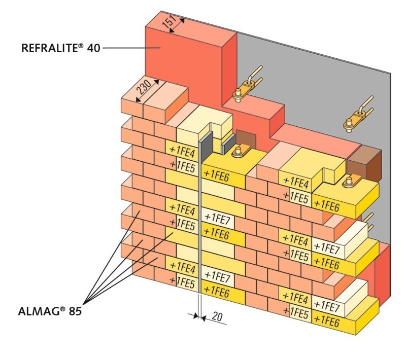 The walls below the vault of the kiln hood as described earlier were lined using a two-layer concept, as shown in Fig. 10. The ALMAG® 85 anchor bricks in shapes +1FE4 up to +1FE7 have a thickness of 230 mm, and the matching anchor brackets of 1.4835 grade steel are wrapped in refractory wool for additional protection. A 151 mm thick layer of REFRALITE® 40 insulating concrete is placed behind the anchor bricks. Moreover, 20 mm expansion joints are provided to compensate for the expansion of the magnesia spinel bricks.