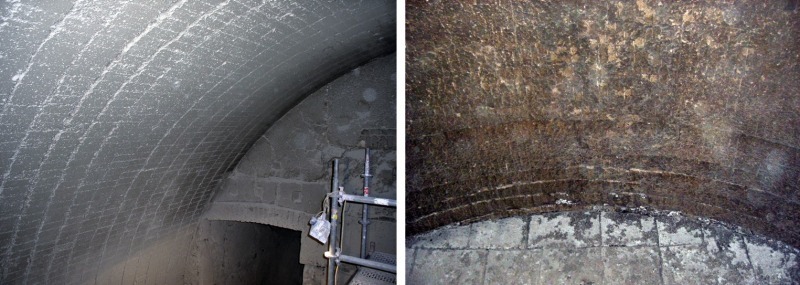In Figure 5 the condition of the refractory lining after lifetimes of 2 (left) and 9 years (right) is shown. After a total service life of 9 years, this lining concept was applied again in the kiln hood.