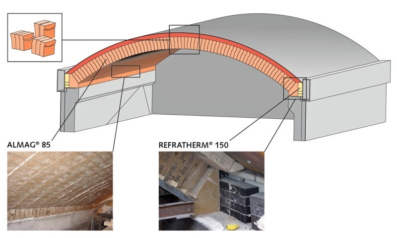 Depending on the steel structure configurations of the kiln hood units, various engineering concepts have been implemented during the past 15 years. Hereby, kiln hood vaults account for a major part of the constructions. The magnesia spinel brick types REFRAMAG® 85, ALMAG® A1, and ALMAG® 85 are used for this purpose. Figure 3 shows a diagrammatic overview of the lining options for the kiln hood of an ongoing project, which will be presented in more detail in the following.