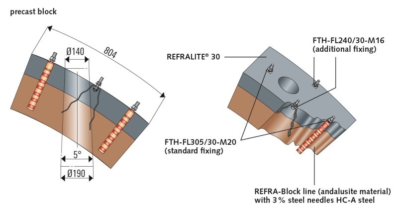 Especially the increasing modernization of older rotary kilns, that means the change from satellite coolers to more efficient grate coolers and correspondingly dimensioned kiln hoods, resulted in higher loads to the kiln hood. This led to the need for complex refractory linings with individual problem solutions.