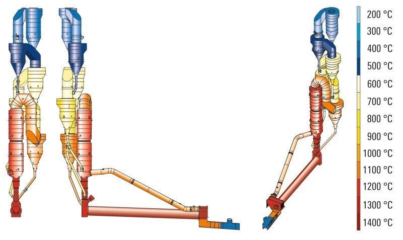 hot and highly abrasive secondary airflows from the clinker cooler, that means laden with clinker dust and with temperatures up to 1150 °C.