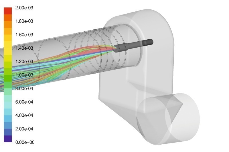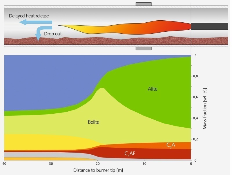 In principle the main burner flame provides very good conditions for the use of alternative fuels by its high temperature, as this supports safe ignition of the secondary fuels despite their generally poorer ignition behavior. However, the sintering process in the kiln also requires high flame temperatures to ensure the product quality of the clinker. This limits the rate of deployment of alternative fuels with low calorific value. The main problem with the use of secondary fuel at the main burner is in the often insufficient residence time of the alternative fuel during the flight phase. Due to the horizontal flow in the rotary kiln, the particles follow, in contrast to the use case in the calciner, rather a ballistic trajectory (Fig. 3 and 4). This can indeed be extended by making use of certain properties of the gas flow, but this only to a small extent. The best leverage for optimization is logically found in the early ignition of the alternative fuel. This can be achieved by guiding the secondary fuel early through a zone of high temperature and high oxygen content. Burner and air ducts have to be designed accordingly. Often also oxygen is used to enhance the ignition behavior. If the fuel falls prematurely and un-burnt into the bed of material, reduced plant performance and fluctuating plant operation is to be expected. Furthermore, through this the amount of heat released is reduced or it is released at a non- optimal location, which in again contributes to the deterioration of the process.