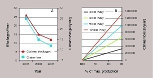 For clinker benefits a different approach is required. Clinker will never be disposed. Clinker with increased free lime will be stored separately and added in small dosage to the product. Clinker blending leads to an average variable cost of clinker. The specific costs of clinker improve if unintended kiln stops (e.g. clogging, coating) are avoided. Lost clinker volume can be compared to a clinker production volume at optimum conditions. A number given to variable cost clinker can be used to calculate the financial benefit of improved availability relative to current production [5].