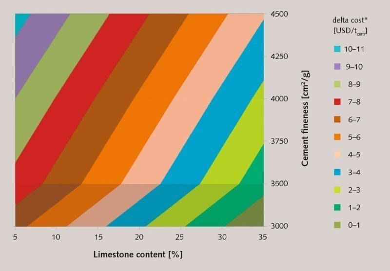 Variable costs of cement are controlled by grinding and cost of cement constituents (Fig. 2). Changing fineness is the first measure when performance of cement is not compliant with targets (e.g. strength at a certain date). If fineness changes are not sufficient to maintain performance of the product also the clinker content will be changed. Both, additional grinding cost and additional clinker change the variable cost of cement (Fig. 2; Fig. 7).