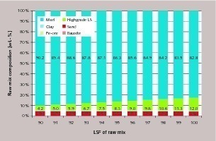 Variable costs of raw mix examples are calculated with three different marls to cover a range of rocks present in the field. Tab. 1 lists variable cost estimates as typical. Cements are processed accordingly. Fig 4. shows in one example the changing composition of the raw meal relative to increments of LSF. These changes will be reflected in variable cost.
