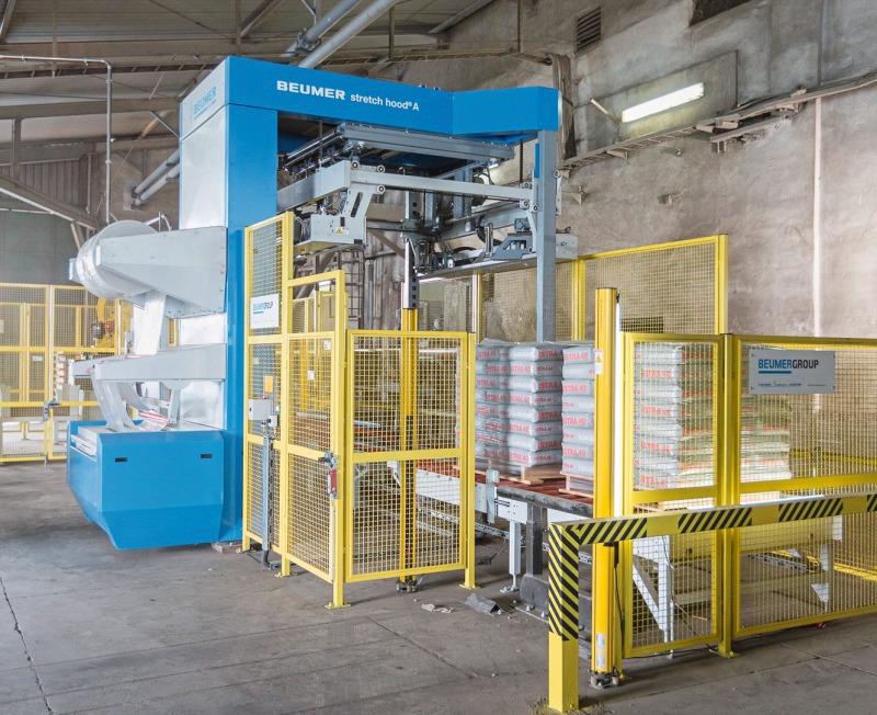 Calucem needed a compact and energy-saving solution for the fully automatic, efficient and above all, fast palletising of the bags. As a single-source supplier, Beumer provided the fully automatic Beumer robotpac, solving complex palletising and de-palletising challenges reliably and efficiently. It distinguishes itself through its remarkable precision and availability, as well as its gentle product handling. An ultrasound system ensures the precise measurement of the bags before they are palletised. This way, the position of the item can be exactly calculated and the bags can be placed precisely and gently. The precision guarantees an optimal stack configuration. This is not only representative of brand quality to the end customer; it also ensures that the stack remains stable during shipping and storage. The Beumer robotpac palletises up to 600 bags per hour. Two gripping tools are used: a suction gripper, that places a paper sheet on the pallet, and a fork gripper, that palletises the bags in the exact position on the carrier. “The flexibility of the Beumer robotpac allows the customer to implement even complex processes with varying frame parameters”, explains David Žargi. In addition, the robotic palletiser is very robust which ensures a secure operation even under extreme conditions. “The drives work reliably, highly efficiently and quietly. Which was an important precondition for the cement manufacturer”, remembers the Beumer expert.