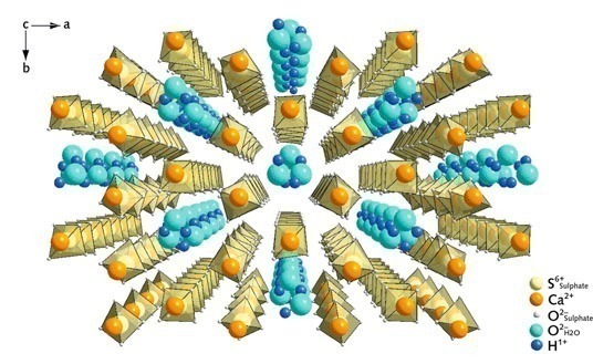 Additives for influencing the crystalline form, such as carbonic acids and their salts, polymers and inorganic substances, are used in the autoclave process for a-hemihydrate production in order to favourably influence the subsequent stages of product processing. The resulting forms can range from filamentous or rod-shaped to discoid crystallites (Fig. 2). Between the first and last-named morphology a shortening of the crystallographic c-axis takes place, which is also associated with a shortening of the “water channels”. Figure 3 shows the hemihydrate structure with corresponding direction of view along the “water channel” arrangement and along the crystallographic c-axis.