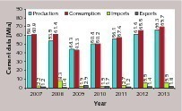 Fig. 15 shows how the cement production increased in the last few years. In 2008 there was a double digit increase in production, but the annual increase slowed down considerably and in 2013 only a little more than 5.0 Mta cement was produced. The capacity stands at 9.5 Mta, which means that only 53 % of capacity was utilised.