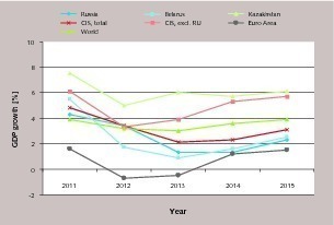 The start of the Customs Union comes at a time of de-orienting economic growth rates in the region. According to the IMF (International Monetary Fund) the CIS countries and Russia were projected in the World Economic Outlook (WEO; April 2014) with 2.3 and 1.3 % growth in 2014 and 3.1 resp. 2.5 % growth in 2015 (Fig. 1). Growth rates in Kazakhstan and Belarus were projected to be 5.7 and 1.6 % in 2014 and 6.1 resp. 2.5 % in 2015, which is higher than the growth rate in the Euro area. But in July 2014 with weaker than projected global growth in 2014 and the geopolitical tensions and sanctions due to the conflict in East Ukraine, the IMF reduced it’s projections for economic growth in the CIS countries and Russia to only -0.4 and -0.1 % in 2014, and to 0.9 and 0.4 % in 2015, respectively.