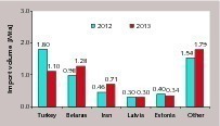 Although in the last two years imports increased only moderately by 1.1 % from 5.462 Mta to 5.521 Mta and major countries of supply did not change significantly, there is a large variation in the volume change from country to country (Fig. 5). The CU member country Belarus has become the top exporter to Russia. Their exports increased from 0.98 Mta in 2012 to 1.28 Mta in 2013, making up 23 % of Russia’s cement imports. Turkey fell from the No. 1 supplier in 2012 to No. 2 in 2013 with 1.1 Mta and 20 % import share. The largest growth was from Iran, which supplied 0.71 Mta last year. In 2013, the cost of imported cement from Iran was 67 US$/t, from Belarus 70 US$/t and from Turkey 76 US$/t, which is below the production costs of the Russian cement producers.
