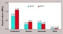 The direction of the major cement exports from Russia is shown in Fig. 6. The chart shows exports to Kazakhstan, Belarus and Azerbaijan and others which cover Armenia and Uzbekistan, but not the Ukraine. Some sources such as The Russian Federal Customs Service (FCS) report exports of 1.297 Mta in 2012 and 1.207 Mta in 2013 to the Ukraine. But this data could not be verified and was therefore excluded from the export statistics. Also the previously mentioned EY Report [1] does not show any Russian cement exports to the Ukraine. Nevertheless the figures underline an increased demand in 2013 in Kazakhstan and surprisingly also for Belarus, which should be in a position to be self-sufficient in cement.