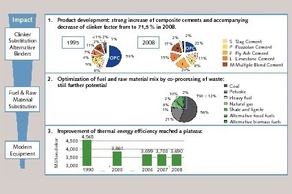 In 2010, the worldwide cement production was over 3 billion tonnes, including China, which is responsible for approximately 60 % of the world production capacity. Estimations put a world cement consumption at well over 3.5 to 4 billion tonnes by 2020 with a corresponding increase in energy, required raw materials and pollutant mass emissions. Consequently, the main ways (Fig. 1) to minimize the environmental and CO2 impacts of the cement sector are: