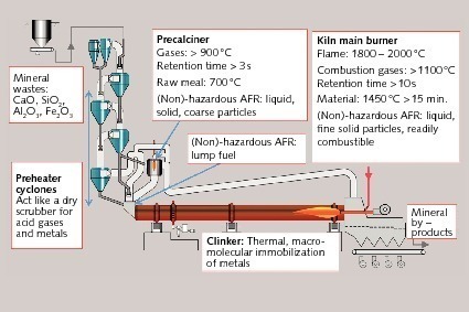 Hazardous waste has to be injected into the high-temperature combustion zone of the kiln system, i.e. the main burner, the pre-calciner burner, the secondary firing at the preheater, or the mid-kiln (for long dry and wet kilns) to ensure a long conversion time at minimum 850°C.