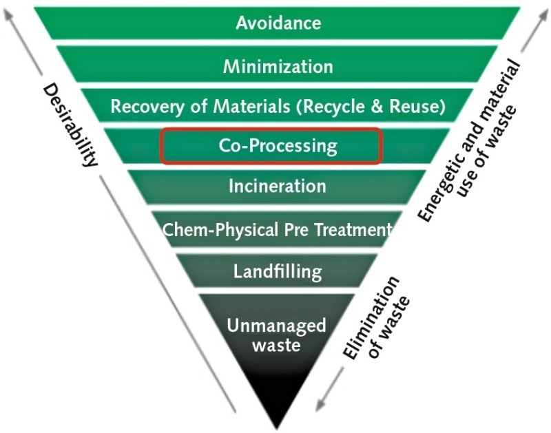 Co-processing is also a preferred solution in the waste management hierarchy (Fig. 5). It is ranked higher than incineration and landfill, as it aims at the use of energy and material from refuse. Legally co-processing of waste if compared with waste incineration also has several advantages. The higher temperatures and residence time in the kiln results in efficient thermal destruction of even the most persistent pollutant. The alkaline lime-based environment in the kiln acts as an absorption gas cleaning. The biggest advantage is that co-processing of suitable pre-processed and proven fuels in a cement clinker process leaves no residue for disposal (refer to Table 1 for details)
