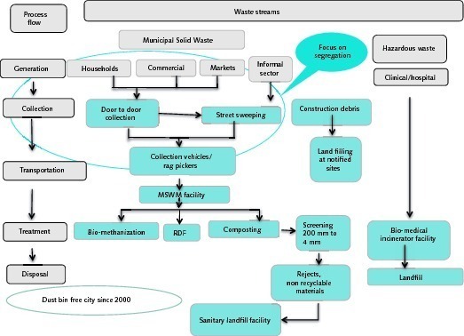 NMC has been successfully operating the door to door collection system for MSW within the city for the last 14 years. Initially, NMC only had a compost plant for processing of organic waste. In 2009, the integrated facility including an upgraded compost facility, RDF and sanitary landfill, etc. were established under the Jawaharlal Nehru National Urban Renewal Mission (JNNURM) of the Ministry of Urban Development, Government of India. The current facility is designed to handle up to 500 tpd of incoming waste. The disposal management of MSW including the waste streams with the process flows in the city of Nashik are broadly explained in Figure 2.