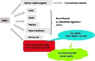 The recycling industry in India is one of the largest in the world. Recycling of plastics happens to the tune of 47 % of the total production [1]. After collection of the portions that can be recycled by mechanical recycling, there remain numerous fractions in the rejected stream like plastics (heavily contaminated articles, multi-layered composites, pouches, etc), jute, rubber, leather, rags, coconut shells etc., which are mostly unattended and allowed to remain in the waste stream, thus forming the large bulk of the municipal solid waste problem. References are available regarding the fact that developed countries are disposing these non-recycleable wastes after pre-treating through co-processing in cement kilns in a sound and environmentally friendly manner. References are also available for reutilizing these portions via incineration in RDF-power plants instead of uncontrolled dumping on landfills.