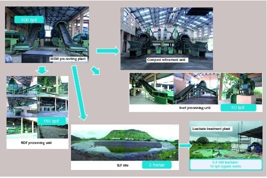 The integrated MSW processing plant at Nashik includes mechanical pre-sorting, inert processing, RDF facility, aerobic windrow composting, sanitary landfill pocket, leachate treatment facility and animal carcass incinerator (Fig. 4). The existing facility has the capacity to treat 500 tpd of MSW. The RDF facility can process 150 tpd of waste and the inert processing facility has a capacity of 50 tpd. The sanitary landfill is spread over an area of two hectares.