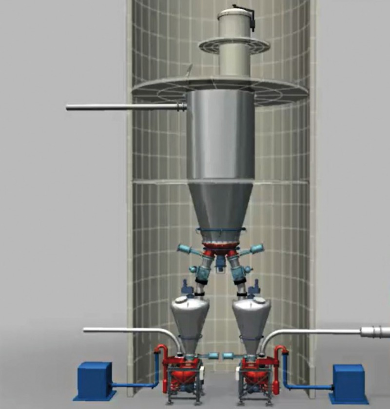 Because the pre-hopper is located above the rotary feeder, the system works with overpressure in the pre-hopper. That allows operating with a higher pressure difference. This advantage can be used for longer conveying distances or higher loads (coal-air-ratio).