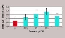 Fig. 6 shows the influence of the quantity of fibres on the strength of the cellular concrete. As was to be expected, the strength of the cellular concrete rises in line with an increasing content of fibres. For these tests, AR-glass cut to a length of 10 cm was used for the reinforcement. Actually, the greatest strength value should be attained at a maximum additive quantity of 1 %, but instead of this the strength decreased again. This was the result of the already described formation of fibre bundles, which negatively affected the strength. On this basis, the optimum quantity of these fibres would be 0.75 % referred to the solids content. The associated bulk densities of the cellular concrete samples were approximately 0.46 g/cm3 and showed hardly any change after addition of the fibres.