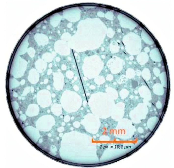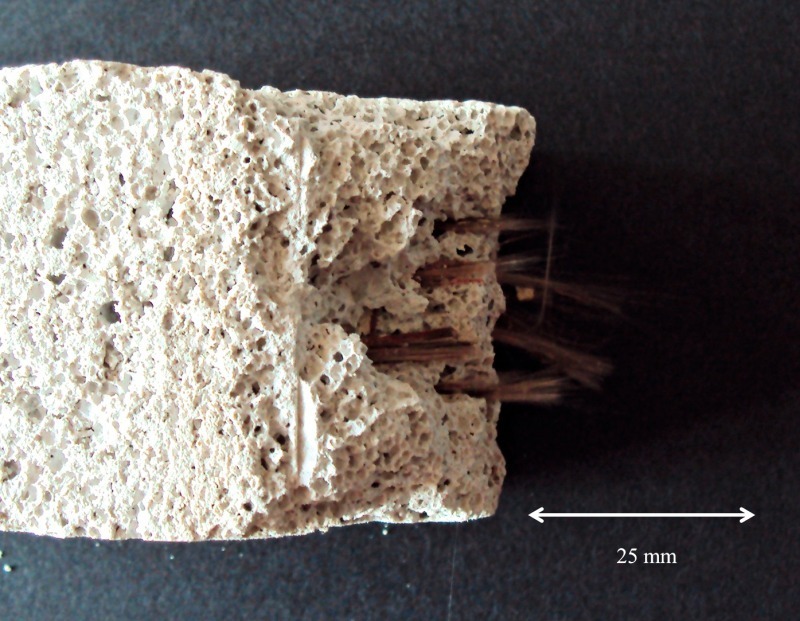 By using a dispersion disk, which can also be used in an industrial-scale operation, it was possible to achieve uniform distribution of the fibres. During this phase of the investigation it was discovered that it was not only the quantity of fibres but primarily the interaction between fibre length and fibre diameter that was decisive for a uniform distribution. If these parameters are not observed, it is impossible to achieve a homogeneous distribution. The formation of fibre bundles shown in extreme form in Fig. 3 was a frequently experienced phenomenon. The fibres were not dispersed throughout the cellular concrete cake but concentrated in the form of a central strand. This form of fibre distribution not only damages the cutting tools but also destroys the strength improvement effect of the reinforcement. The strands partially act as a defect point with reduced strength. It is therefore essential to assure uniform distribution of the fibres.