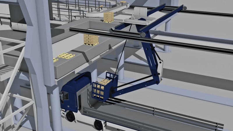 The fully automatic loading cycle starts with the scanning of the truck cargo bed. During loading open trucks are sequentially fed with bag stacks in two lanes, which is performed by a moving bridge installed over the truck. Once the loading process is done for the first truck, a lane change by the SpeedFlexx takes place in just a matter of seconds and the new, parallel-positioned truck is loaded.