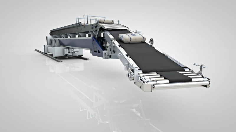 The SpeedLoad loads single bags without pallets at a speed of up to 120 t or 2400 bags per hour. Suited for open trucks, trailers with or without side walls, and containers, the design features a front part that can be lifted, lowered and swiveled and thus allows side, back loading and from-the-top loading. All common bag types can be handled.