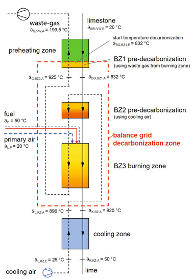 In contrast to a static balance, this model can be used for calculating in-kiln temperature profiles for limestone/lime and gas (air and combustion gases). This way, the kiln’s length and the length of the individual process zones (preheating, firing and cooling zones), i.e., the kinetics of heat transfer and lime burning throughout the kiln, are all taken into account. A limestone fraction with influence on the kiln’s pressure differential and on the degree of conversion of the individual fractions can be specified for the calculation.