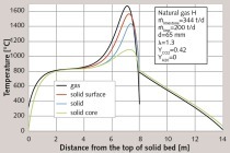 The results of such calculations (gas and solid temperature profiles) have been compared with data taken from thermocouples passing through a real kiln, corresponding to the progress of the limestone/lime column and showing concordant results. These calculations also make use of the aforementioned thermal limestone data.