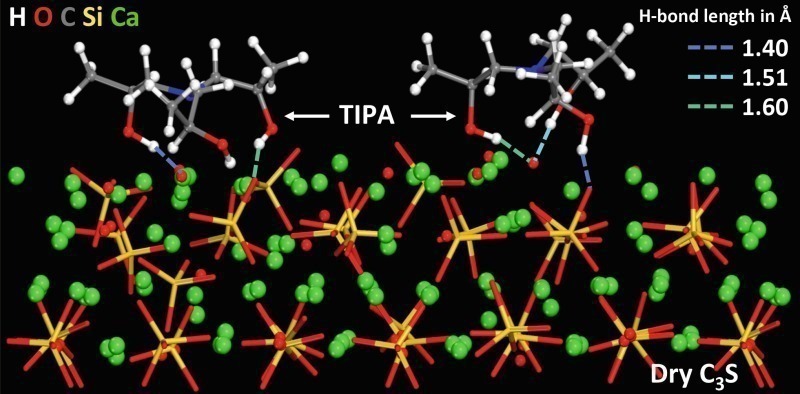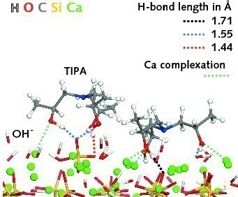 Figure 13 shows the adsorption of diisopropanolamine (DIPA) schematically. The spatially correct arrangement of the similar triisopropanolamine (TIPA) on hydroxylated tricalcium silicate (C3S, alite) is shown in Figure 14. Hydrogen atoms (H) from the alcohol groups of the TIPA form hydrogen bonds with oxygen atoms (O) of silicate and hydroxide ions. The calculated average bond lengths are shown in Figure 14. Oxygen atoms (O) of the alcohol groups of the TIPA coordinate with calcium ions (Ca) of the C3S. Similar interactions and arrangements also occur with other clinker phases (C2S, C3A) and grinding aids [11, 12].