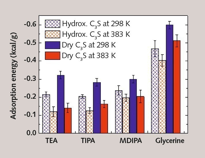 The adsorption energies of various organic compounds on clinker surfaces were determined in order to clarify whether the grinding effect is dependent on the strength of adsorption. Instead of the route via the surface and interfacial energies (equation 1) of C3S and grinding aid, there was direct simulation of the quantity of energy that is released during the adsorption of gaseous molecules on C3S.