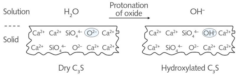 As a rule of thermodynamics, chemical reactions only take place by themselves if this involves the release of energy (usually heat). They cannot therefore be reversed without external energy. This is also the case in the reaction of cement with water. Water from moist raw materials and from the injection of cooling water is usually present during the industrial grinding of cement, even without the use of grinding aids. Therefore it can be assumed that the surfaces of the majority of commercial clinkers are predominantly or even completely hydroxylated. This is also important because it assists the grinding, in other words water is a weak grinding aid. The chemical reaction of oxide ions (O2–) with water (H2O) to form hydroxide ions (OH–) takes place irreversibly (Fig. 3).