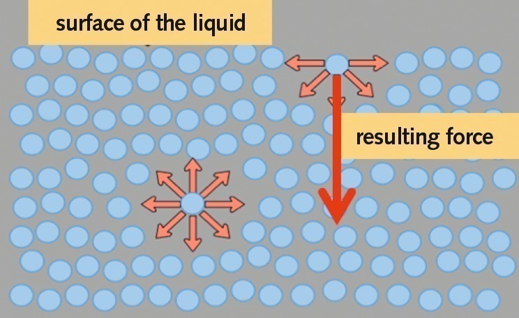 Atoms, molecules and ions always interact with one another. Within homogeneous solids and liquids, the internal forces of opposite direction with equal magnitude cancel each other out. The formal energy is zero in the bulk. But at the interface, there is a resultant force directed inwards due to cohesion (air-liquid interface shown in Figure 4, [6]). The energy of the top layer of surface atoms is above zero due to less binding sites. Solid materials possess surface energy and liquids also have surface tension. Nominally these two are identical due to same value and dimension. Surface tension is a common phenomenon. Therefore, small droplets are round and water striders as well as other small water-shedding objects do not become wet but “float” on the top of water (Fig. 5, [7]).