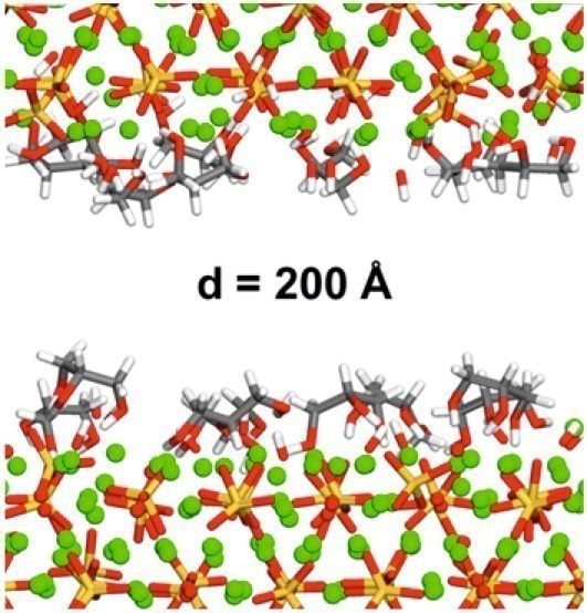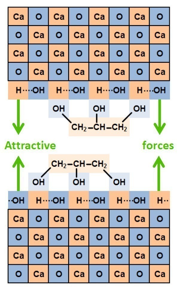 Agglomeration energy can be understood as follows: the release of stored energy when two parallel relaxed cleaved surfaces come together or equally the required energy to separate them. Dry and hydroxylated tricalcium silicate surfaces (“C3S”, “HC”) without and with various grinding aids were simulated in analogy with Figures 9-13. Figures 16 and 17 show a monomolecular layer of glycerine in the confined and separated states between cleaved C3S surfaces. The difference between the two calculated energy levels is the agglomeration energy. The distribution of the glycerine molecules in the separated state does not play a crucial role [2]. An example with equal distribution is shown in Figure 18.