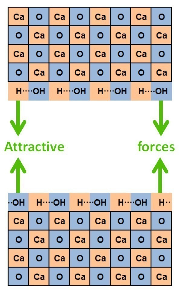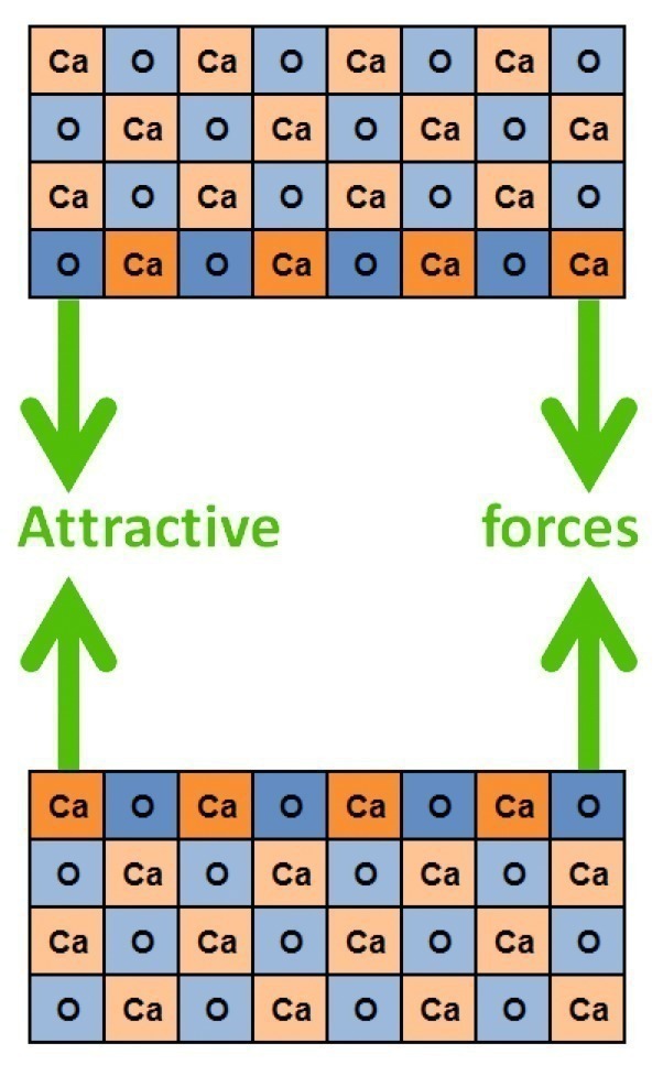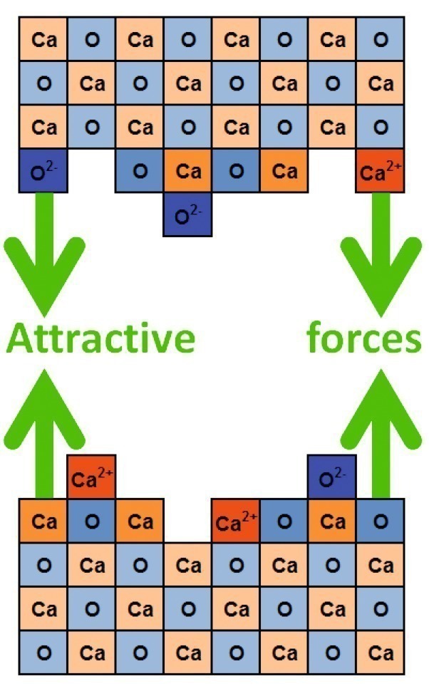 Figures 8-13 show various possible ways how new surfaces are formed and subsequent chemical and physical processes during grinding. Calcium oxide (CaO) is used in the diagrams for simplification instead of a clinker phase. Exposed surface ions are denoted with full charge (Ca2+, O2–) but the overall crystal is neutral, so no charges are marked in the intact crystal lattice. The lighter the colour of the squares in the diagrams the lower is the polarity. The thinner the green arrows, the weaker are the interactions between cleaved surfaces. A cleavage with significant charge separation (Fig. 8) is only possible in the complete absence of water and even then is very unlikely. Freshly cleaved polar surfaces relax immediately. Surface atoms reposition themselves in accordance with minimum energy and optimized charge equilibration [2]. In the usual presence of water (or hydroxide ions) this takes place particularly rapidly as the hydrogen ion transfer (movement of protons), with half-lives in the pico-second range, is one of the fastest known chemical processes.