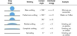 Liquids with high surface tension do not wet substance with low surface energy. Mercury forms beads on non-metallic materials. On the other hand, liquids with low surface tension spread out on substances with high surface energy. Penetrating oil penetrates into the finest cracks and eventually covers the entire work piece. In the same way, grinding aids distribute themselves over the entire surface of the clinker. However, on materials with low surface energy, such as plastics, they form shallow droplets, i.e. the surface is only partially wetted.