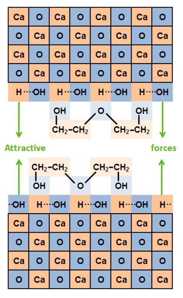 On the one hand, PCEs work in a similar way to the low-molecular weight compounds. They partially compensate the polarity of the clinker surface through the coordination of their polar groups and they reduce it further through the shielding effect of their nonpolar alkylene groups. Though, in contrast to traditional grinding aids, PCEs contain no chemical groups of moderate polarity, in particular no alcohol groups, but only weakly polar ether groups and strongly polar acid groups or charged carboxylate groups.