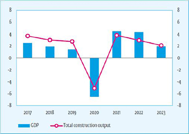 As a whole, non-residential construction output (new and renovation) is growing at a pace of 1.5 % per year with 14 growing countries over the 2019-2021 period. But it should be noted that public buildings and offices are reversing the non-residential market in the UK and Germany. This is mainly due to public budget allocation and the anticipated effects of Brexit. An abrupt stop is expected in the offices’ sector progression in the UK.