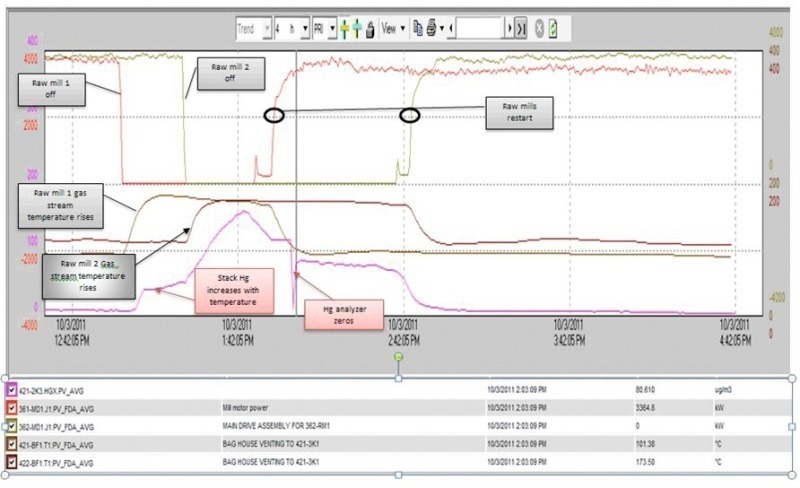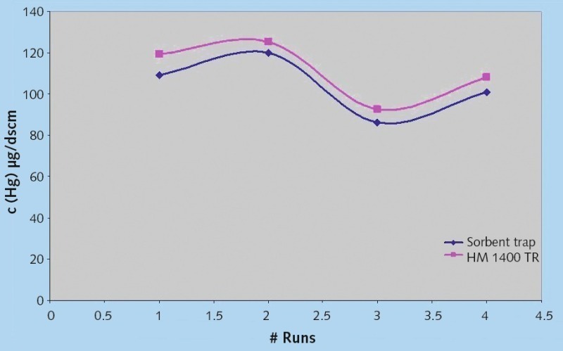 By regulation the allowed mercury level in the stack as a yearly average is 11 µg/m3. The results show a significant difference in the species and in the concentration level of mercury when the mill is in operation or not. When the raw mill is running more than 95 % of the mercury in the stack is Hg0 at a 10 µg/m3 level or lower. When the raw mill is switched off most of the mercury is ionic at a level higher than 100 µg/m3.