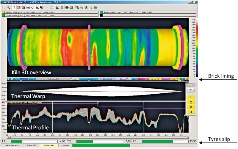 The evolution of the thermal non-axisymmetrical distortion of the kiln provides information on the process evolution inside the kiln: evolution of coatings, kiln push of unburnt material, flame adjustment, etc. The actions taken to solve process anomalies react very quickly on the shell distortion, the clearance between tyres and shell, and of course the shell temperature.