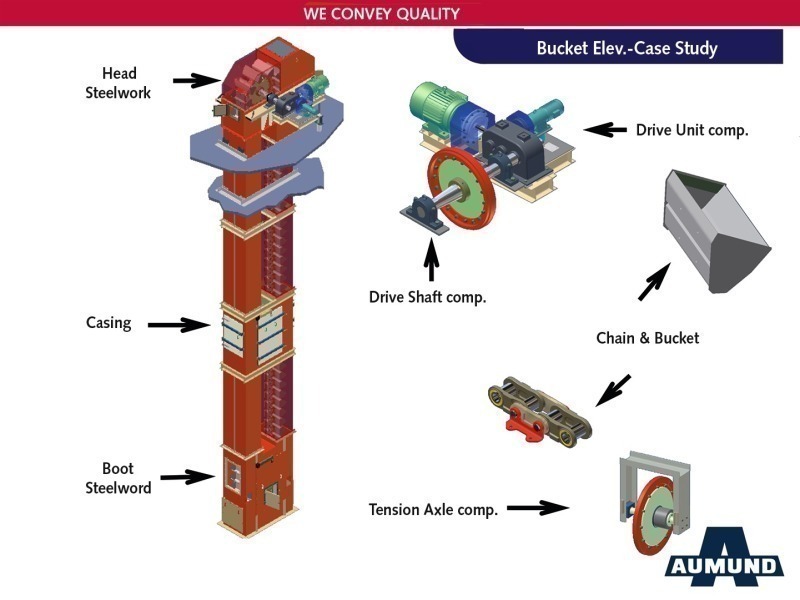 It is not always necessary to install a new machine in order to assure trouble-free functioning of the production plant. Often it makes better economic sense to convert an existing system, and retain the known and trusted quality and reliability. When converting a bucket elevator (Fig. 1) for example, it is possible to reuse the existing steelwork, such as bucket elevator head, bucket elevator boot, discharge chute, feed chute and casings, in practically every case. Compared to the installation of new steelwork, the cost outlay is reduced by more than 30 %. If other bucket elevator components, such as motor, gearbox or drive shaft can also be reused, the financial saving will be even greater.