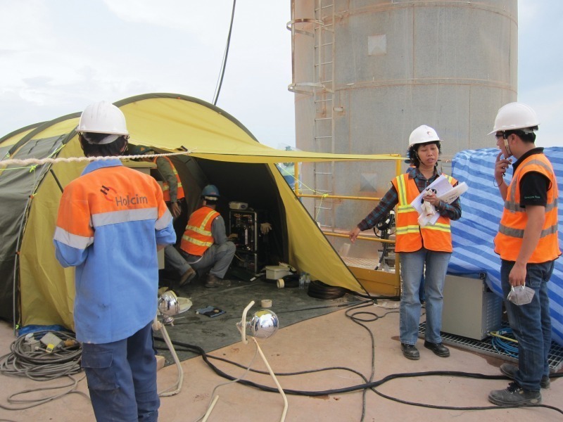 High strength PCB was transported to the Hon Chong cement plant in South Vietnam in steel drums and diluted in two 16 000 l feeding tanks, making two batches for two days testing (Fig. 3). The entire test campaign was carried out over three days; the first day a baseline test was performed, i.e. with stack gas sampling under normal conditions with coal firing only and with the exit gas through the raw mill in compound mode – the next two days, a mix of PCB and used oil was fed to the main burner of the kiln; only the first test burn day however was complete.