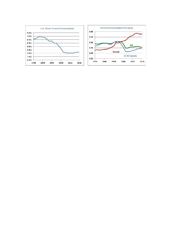 The U.S. cement industry represents a market of nearly one hundred million metric tonnes. The total U.S. capacity is approximately 96 million metric tonnes. The difference is absorbed through imports. The total global cement consumption in comparison is 4.17 billion metric tonnes. Cement production in China accounted for 2.4 billion metric tonnes or more than half of all global cement production. India, the next largest cement producer, consumes just under 290 million metric tonnes annually. The United States then accounts for less than 10 per cent of global cement production...