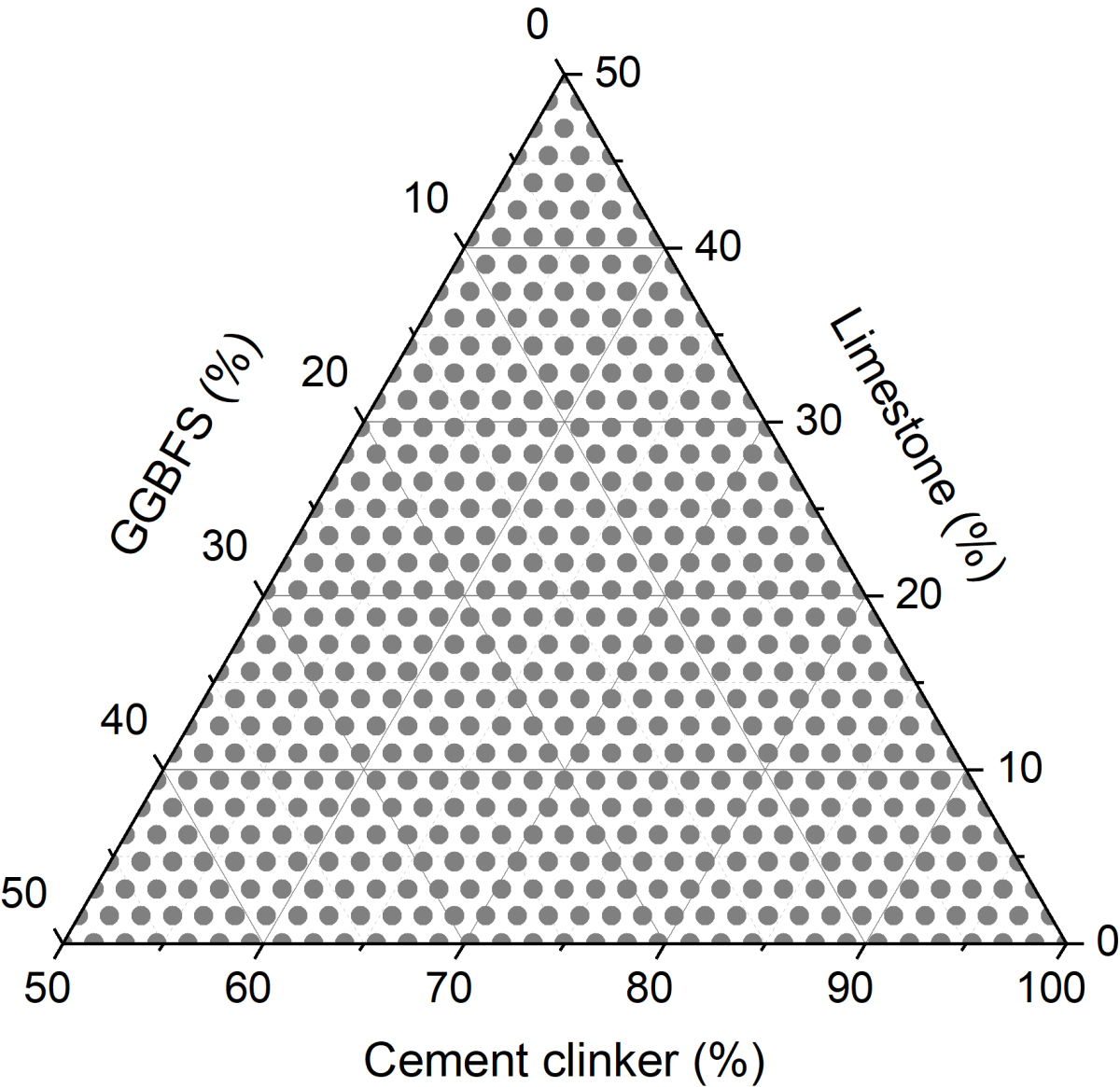 Composite cements with a broad range of compositions from 50 – 100 wt.-% of cement clinker, 0 – 50 wt.-% of granulated blast-furnace slag (GBFS) and 0 – 50 wt.-% of limestone (Figure 1) were virtually investigated. Composite cements were obtained from cement clinker, GBFS and natural limestone. All these materials were characterized by compositions typical for the European markets [3]. For the calculations it was assumed that the slag and limestone contain only glassy phase and calcite, respectively. The overall SO3 level was set to 2.75 % by adding calcium sulphate (anhydrite).