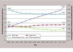 Figure 1 shows the development of China’s population since 2000. As can be seen, China’s population has been growing during the past 10 years, with a more than 7 million annual net increase of population, which is equivalent to the population of a medium-sized country in Europe. In order to maintain employment, housing, and infrastructure, large amounts of cement and building materials are consumed. Therefore, China has the world’s largest cement production.