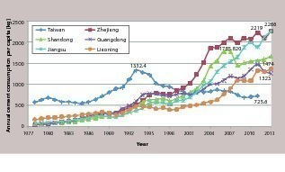 Considering that developed and emerging countries and regions are not comparable, we chose a few developed provinces in China as reference for the forecast. Figure 6 is data chosen from a few of the developed provinces as a reference criterion. It can be seen that the consumption per capita of Liaoning, Guangdong, Shandong and Zhejiang respectively peaked between 2007 and 2012. The highest consumption of cement per capita is between 1.3 and 2.2 tons. China reached its national average of 1.8 tons in 2013. Because China’s cement output is still growing, we forecast the maximum consumption range of Chinese cement demand will reach the apex of consumption per capita of 1.8-2.2 tons between the years 2015-2020 (see Fig. 3).