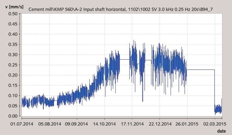 The condition monitoring system was installed on the gear unit of the vertical mill drive in 1998 – and just in time, since a damaged motor bearing was diagnosed when the very first measurements were taken. This was quickly rectified during a brief, scheduled downtime.